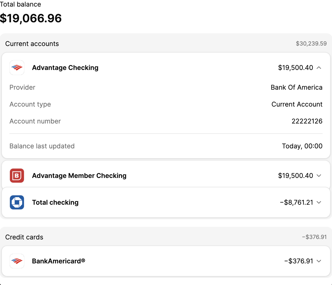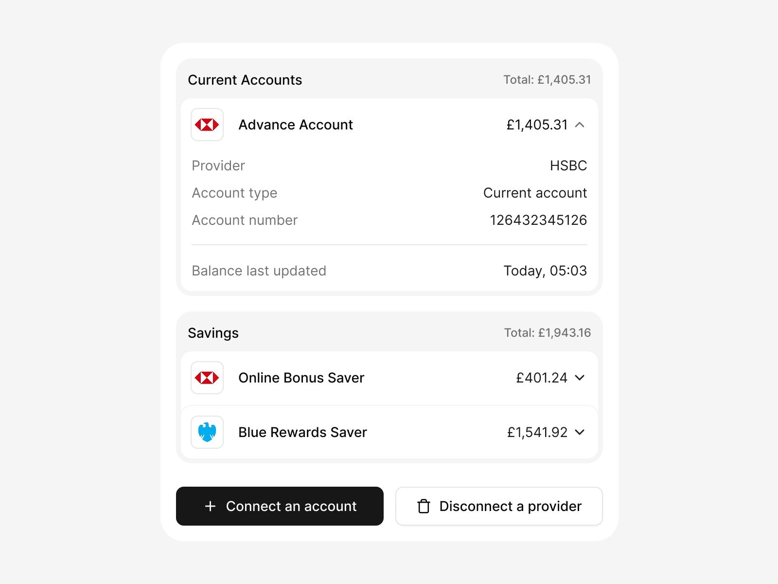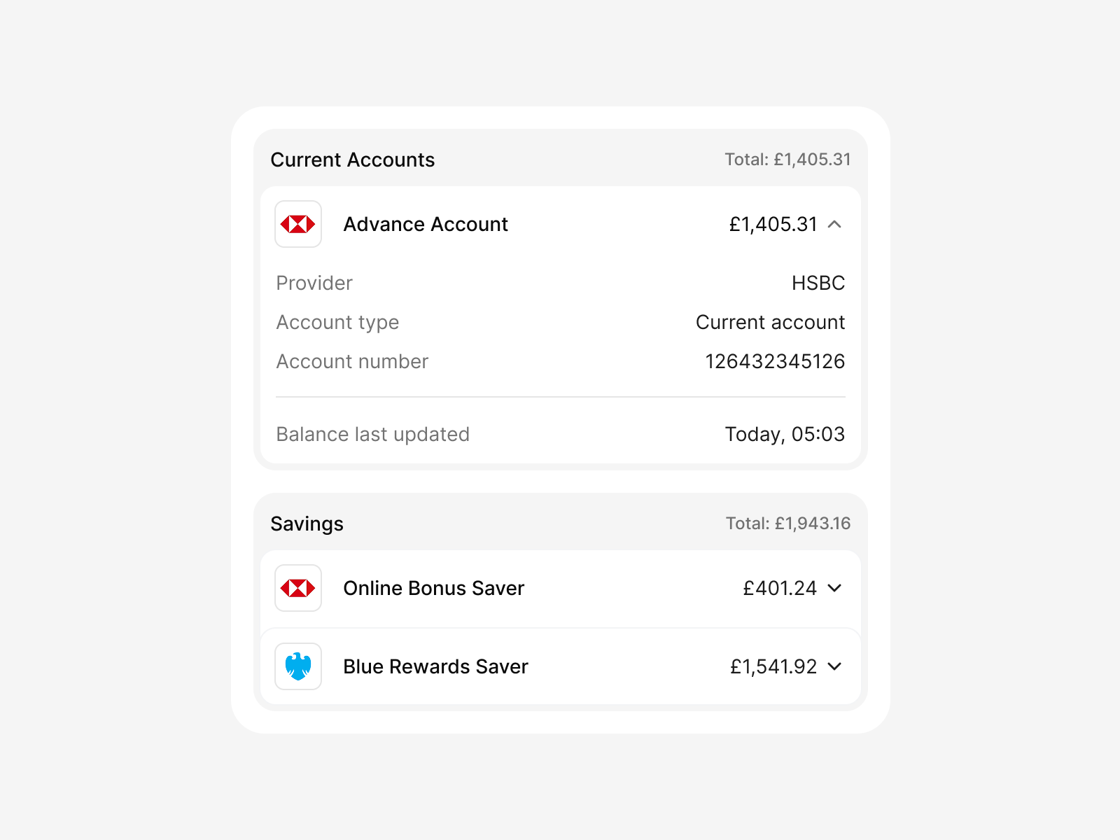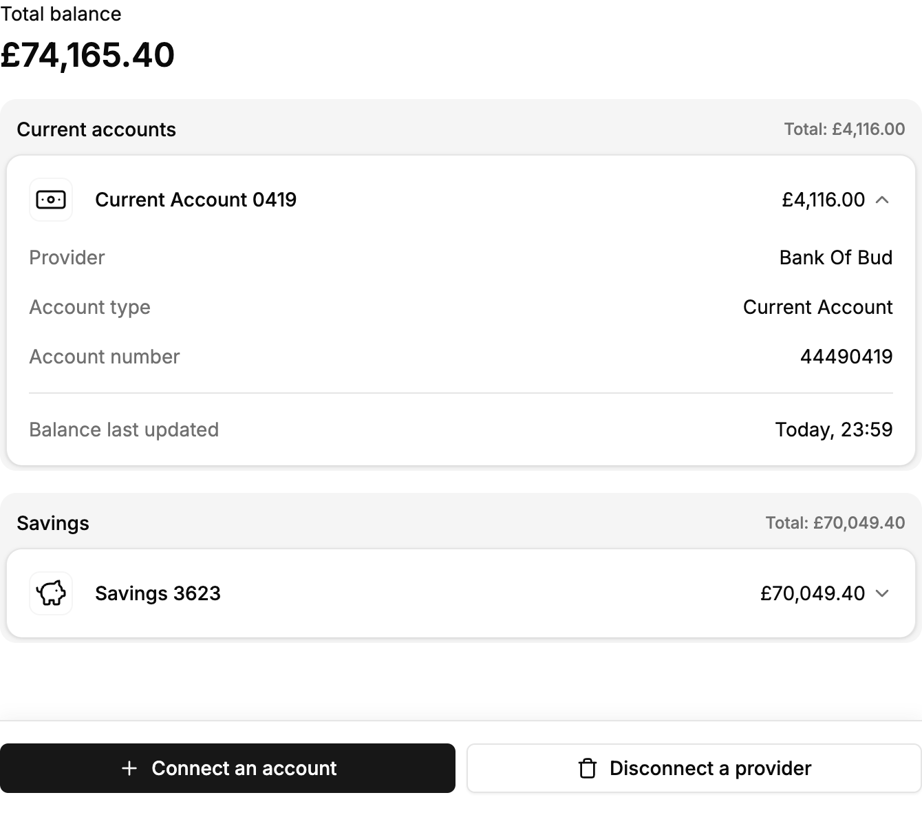Accounts are automatically grouped by account type. For each group, the widget displays an aggregated balance, allowing users to quickly understand their financial position across multiple providers. For example, all current accounts, regardless of provider, will be grouped together.