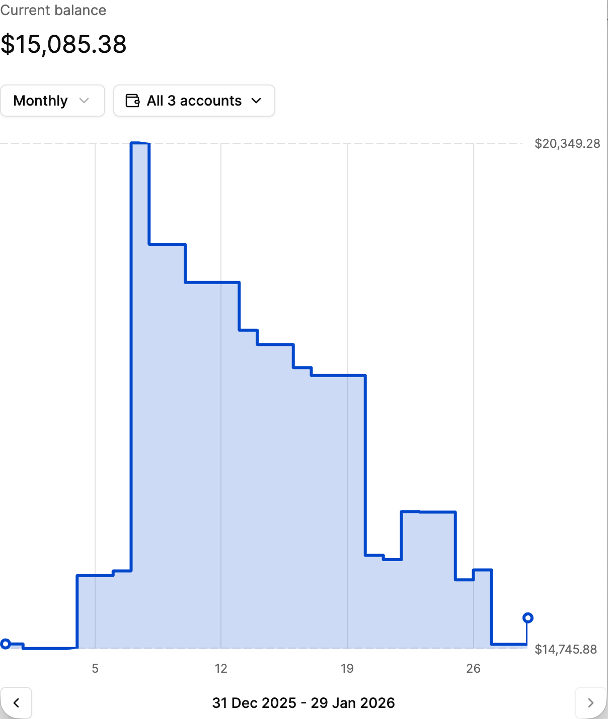 Use the tabs at the top of the graph to toggle between an aggregated view (all accounts combined) and individual account views. This allows users to analyse overall financial trends or focus on specific accounts.