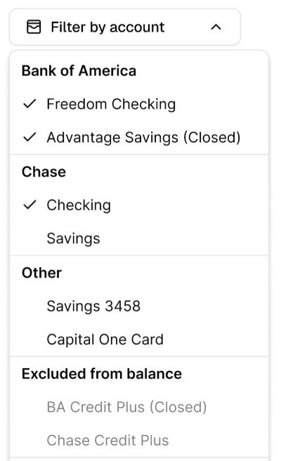 By default the following account types will be excluded from the Balances Over Time widget, meaning your customers can't select them. If you would like to update this please reach out to your Bud account manager.